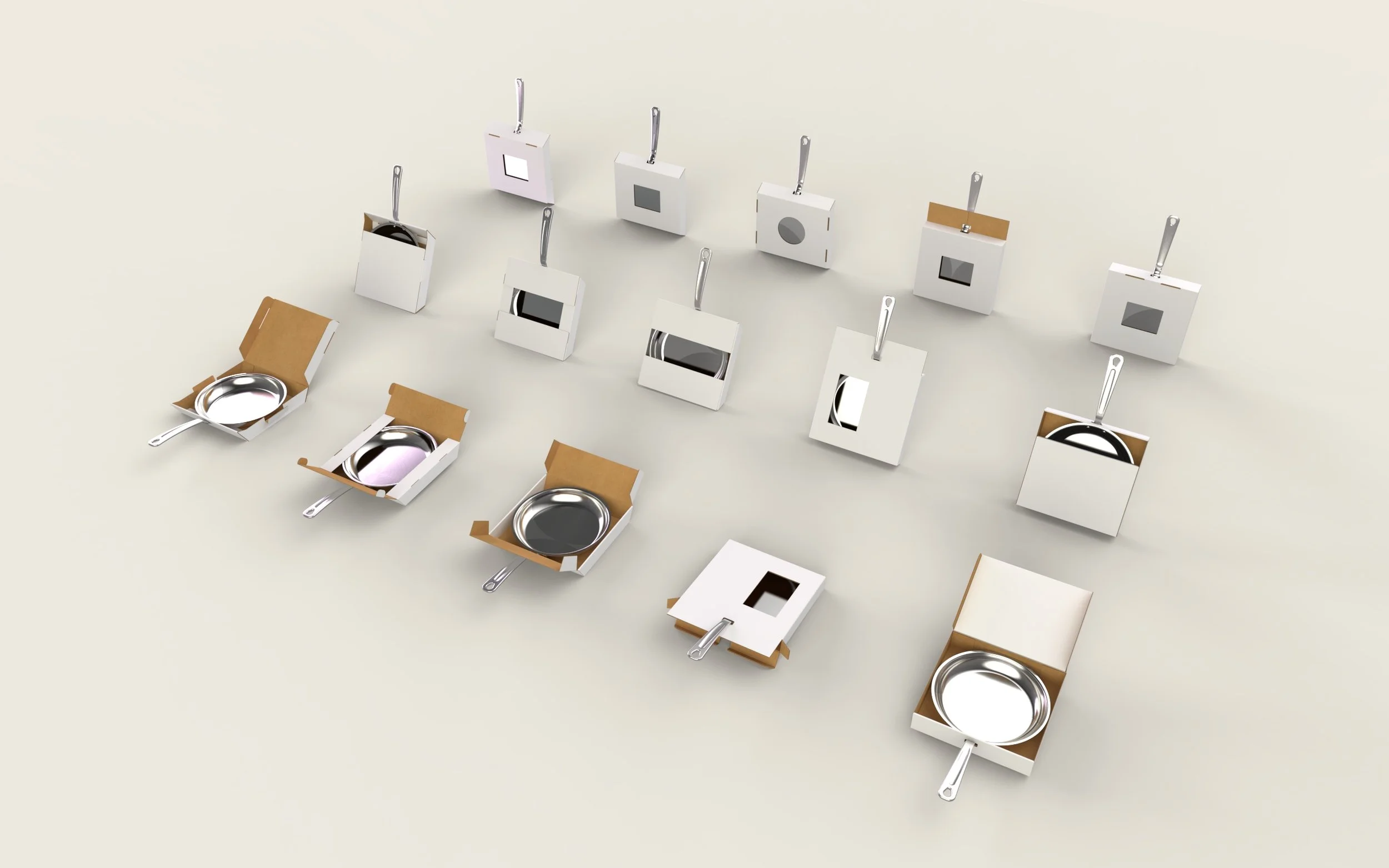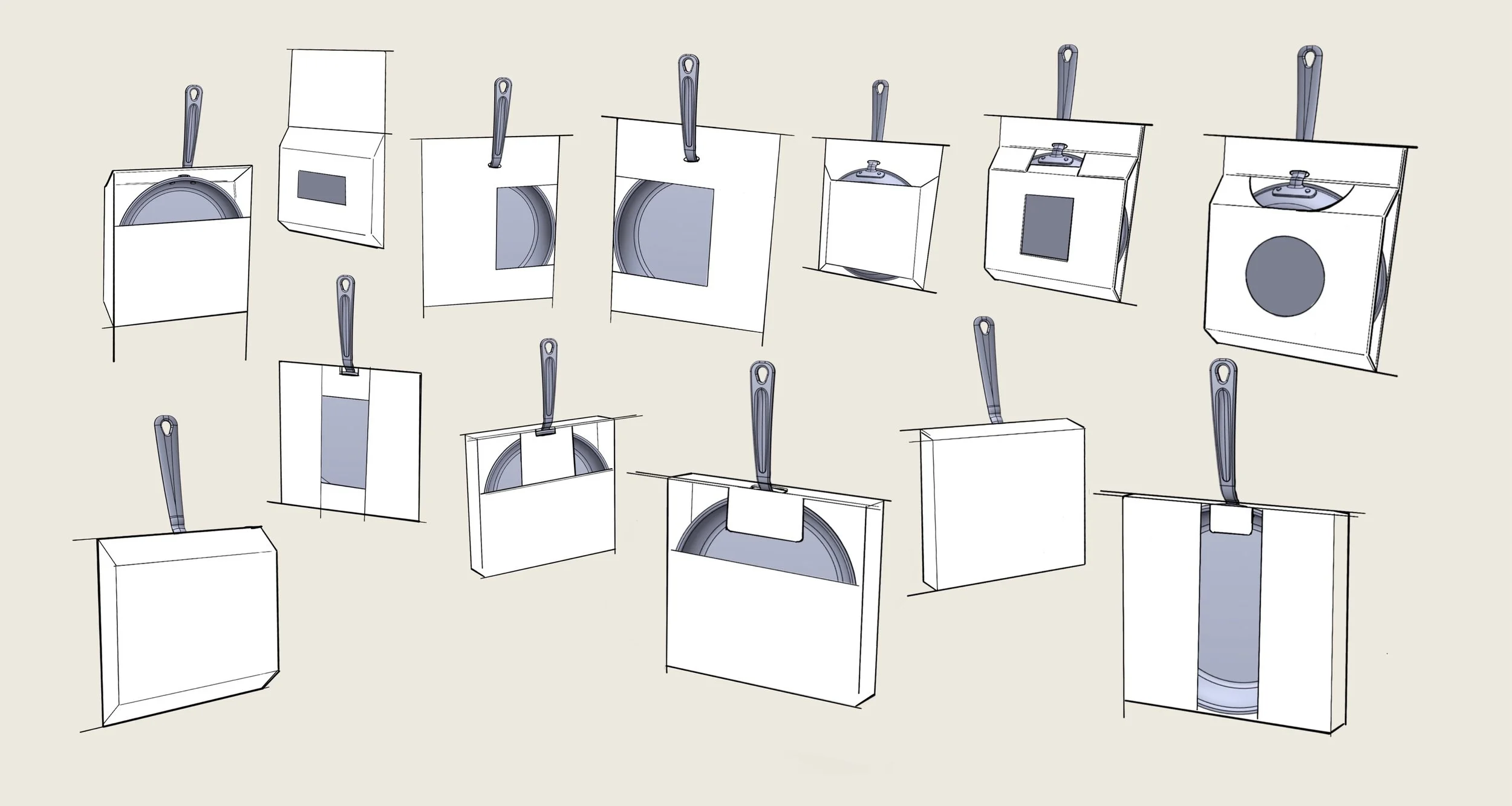 Initial concepts focused on unique ways to showcase the product while protecting both the pan body and handle.