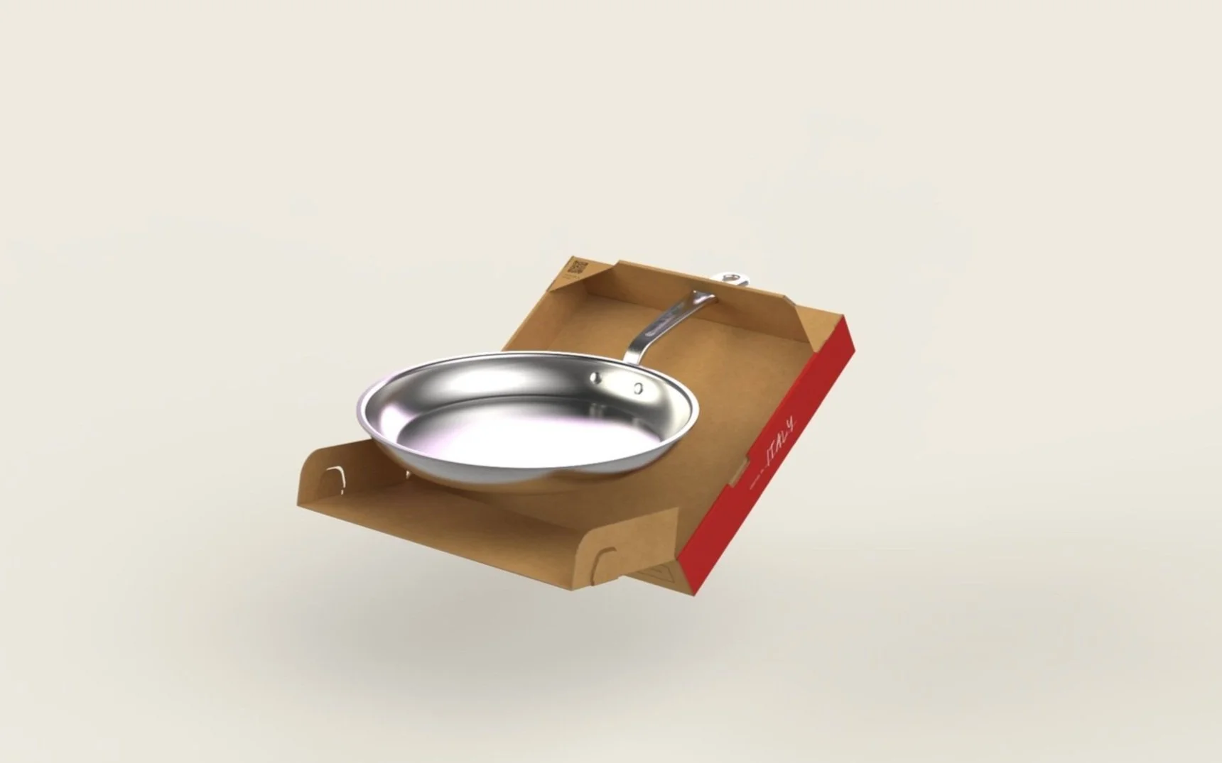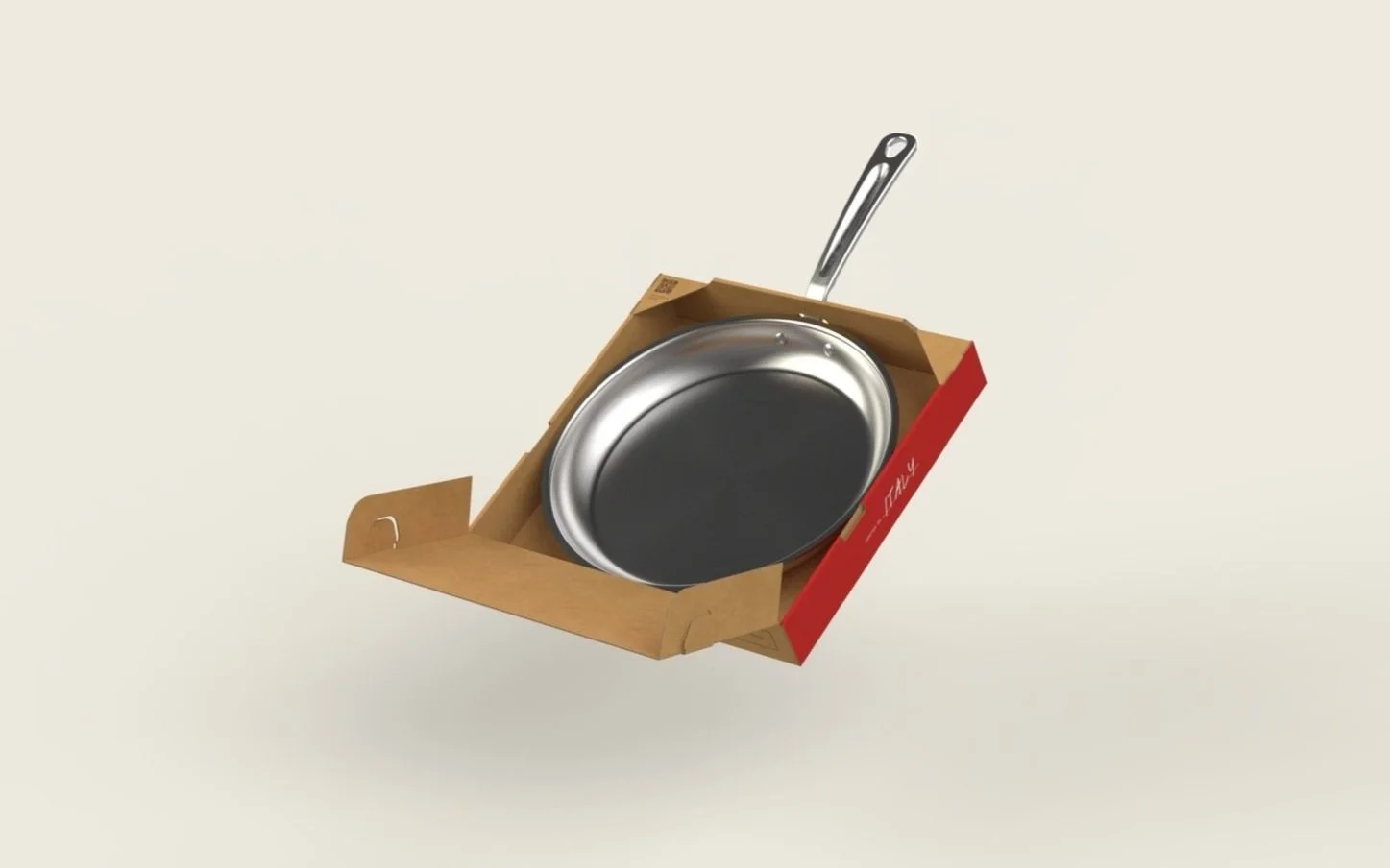 The production concept utilized a rectangular tray design with an elevated panel to locate and secure the pan in place. This worked in conjunction with the partial front panel to showcase the pan with intentional branding assets and connection to their web presence through a QR code on one of the reinforced corners.